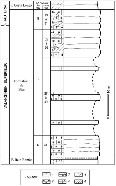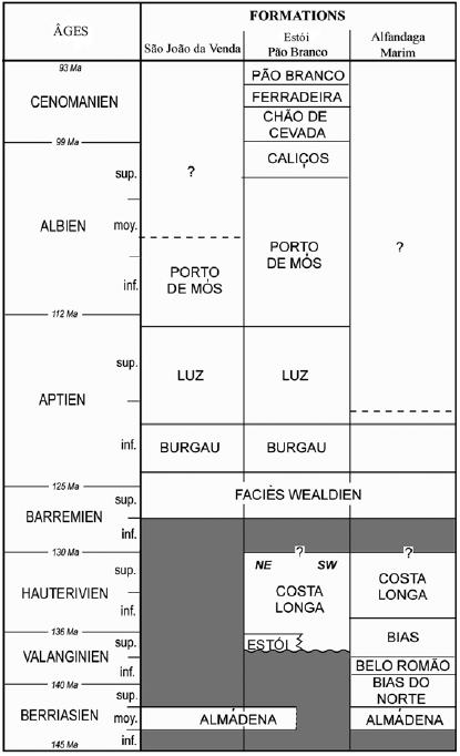 Âge: la présence, dans les éléments remaniés, d’Arcostrea rectangularis prouve que la Formation d’Estói est d’un âge plus récent que le Berriasien. Par ailleurs, cette unité lithostratigraphique passe latéralement vers le Sud (au niveau du relief de Costa Longa) à la partie inférieure de la Formation de Costa Longa, équivalent latéral de la Formation de Bias. Il convient donc d’attribuer à la Formation d’Estói un âge valanginien (CORREIA, 1989) et non hauterivien (REY, 1982).