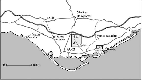 – les affleurements de la région d’Estói, Conceição et Pechão (Fig. 4) où plusieurs tronçons de coupes peuvent être levés: dans le quartier de Vale de Mouro, au Sud-Est d’Estói; de part et d’autre du relief de Costa Longa; depuis le signal de Caliços jusqu’aux hameaux de Galvana et Pão Branco.