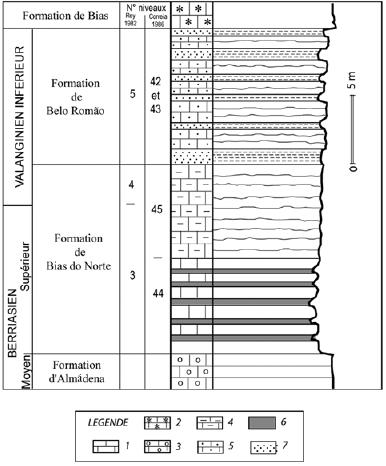 – la Formation de Bias do Norte, composée de calcaires de plate-forme ouverte et datant du Berriasien supérieur-Valanginien basal, est l’équivalent latéral en Algarve oriental de la Formation terrigène et fluviatile de Fontes da Matosa connue en Algarve central (anciennement “arenitos de Sobral”) et de la formation calcaréomarneuse et margino-littorale de Porches présente en Algarve central et occidental;
