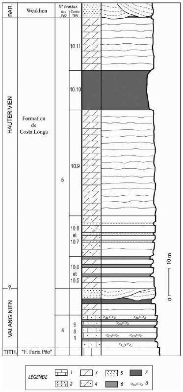 Âge: la partie inférieure de la Formation de Costa Longa passe latéralement vers le Sud-Est à la Formation de Bias. Par ailleurs, en bordure de la route E.N. 125, les calcaires récifaux de Bias sont directement surmontés par les dolomies gréseuses de la formation de Costa Longa. Les dinokystes chorates sont généralement fréquents à l’Hauterivien (CORREIA, 1989). On peut donc attribuer un âge Valanginien supérieur-Hauterivien à la Formation de Costa Longa.