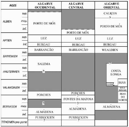 – l’enregistrement sédimentaire se généralise dans tout le bassin de l’Algarve au cours du Barrémien supérieur puis s’uniformise au cours de l’Aptien inférieur. Dans un premier temps (Barrémien supérieur-Aptien basal), il illustre la passage des environnements lagunaires de la Formation de Barrancão en Algarve occidental aux milieux fluviatiles à faciès wealdien de l’Algarve oriental, les dépôts de l’Algarve central présentant des faciès mixtes et intriqués. De l’Aptien inférieur à l’Albien supérieur, les mêmes unités lithostratigraphiques peuvent être reconnues dans tout l’Algarve, avec la succession de dépôts carbonatés de plate-forme moyenne (Formation de Burgau), et de plate-forme restreinte (Formation de Luz, Formation de Porto de Mós);