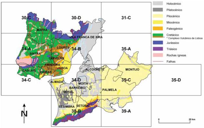 Fig. 1 – Mapa geológico da região da AML com os limites dos concelhos e esquema das correspondentes folhas da Carta Geológica, na escala 1/50 000 (adaptado da Carta Geológica de Portugal à escala 1:500 000, 1992).