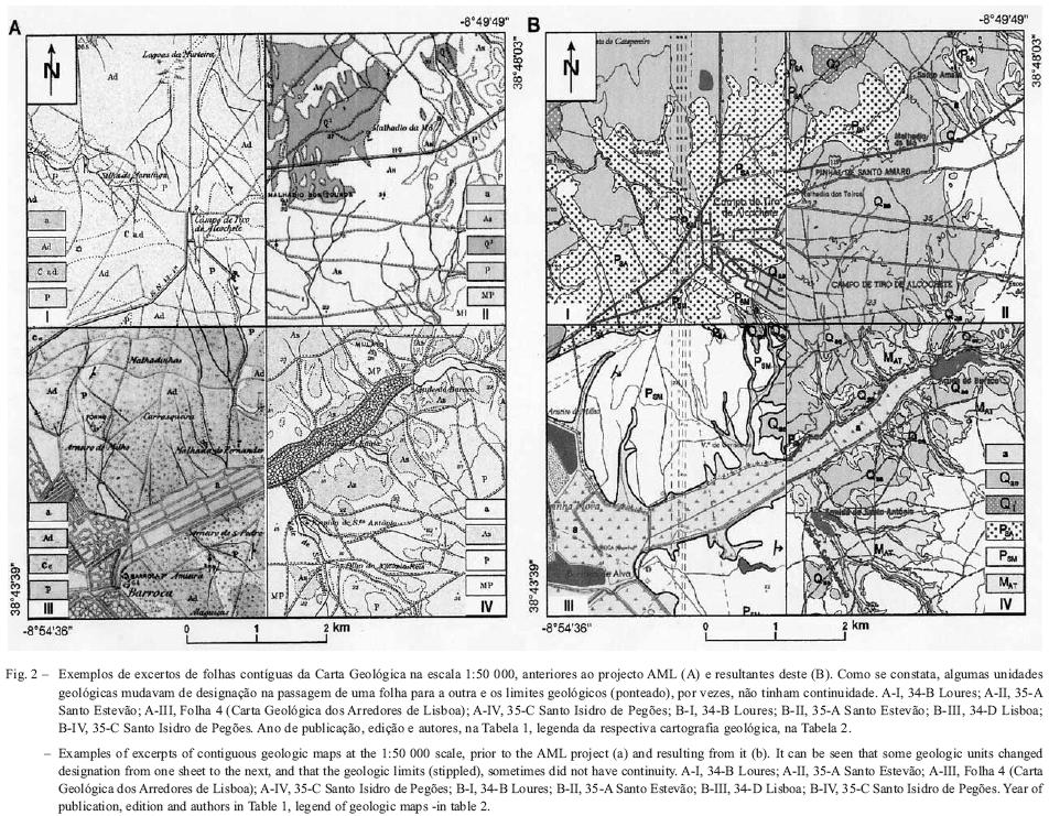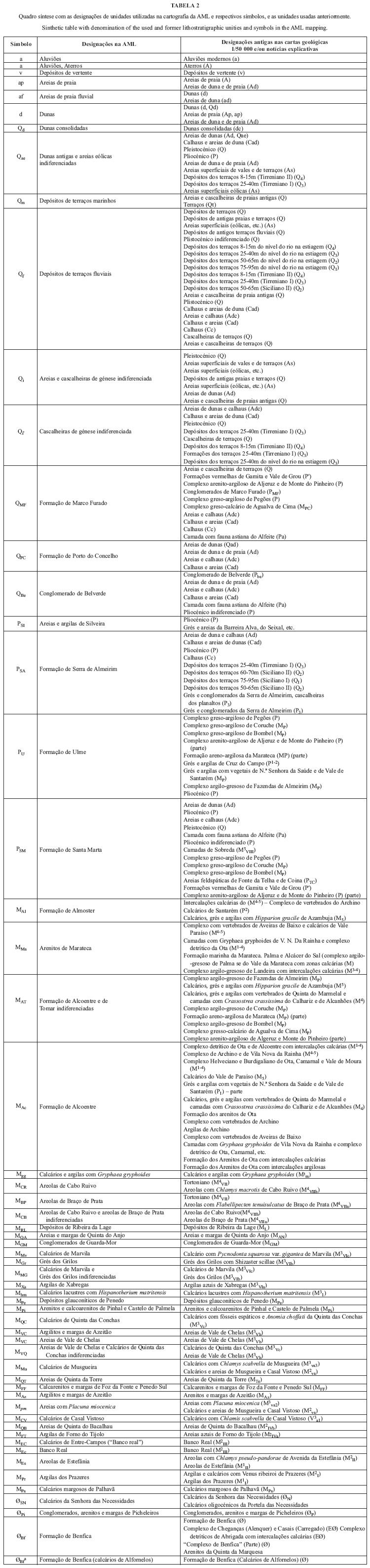 Este protocolo, que teve como principal objectivo a revisão e actualização da cartografia geológica de base e produção de cartografia geológica temática para a região da AML, permitiu que se efectuasse a normalização e homogeneização das unidades litostratigráficas representadas na carta geológica, estabelecer correlações entre elas (Tabela I) e a elaboração de mapas de conjunto a várias escalas.