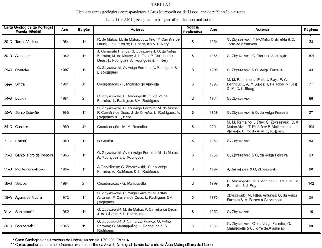A partir dos finais da década de 1950, G. ZBYSZEWSKI e O. DA VEIGA FERREIRA procederam aos levantamentos da maioria das folhas ainda hoje em utilização (Tabela 1). Algumas destas foram alvo de reedição recente, feita com o contributo de G. MANUPPELLA (Tabela 1). Foi ainda publicada a Carta Geológica do Concelho de Lisboa, na escala 1/10 000 (ALMEIDA, 1986).