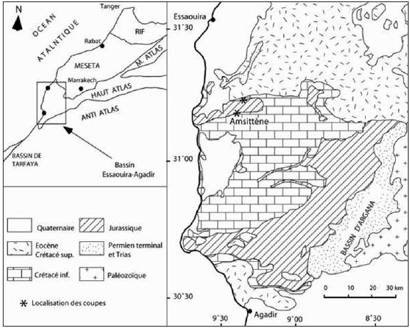 le recouvrement total de la série jurassique dans la zone dAmsittène est de 2200 m alors quil est de 3000 m dans la région dAgadir.