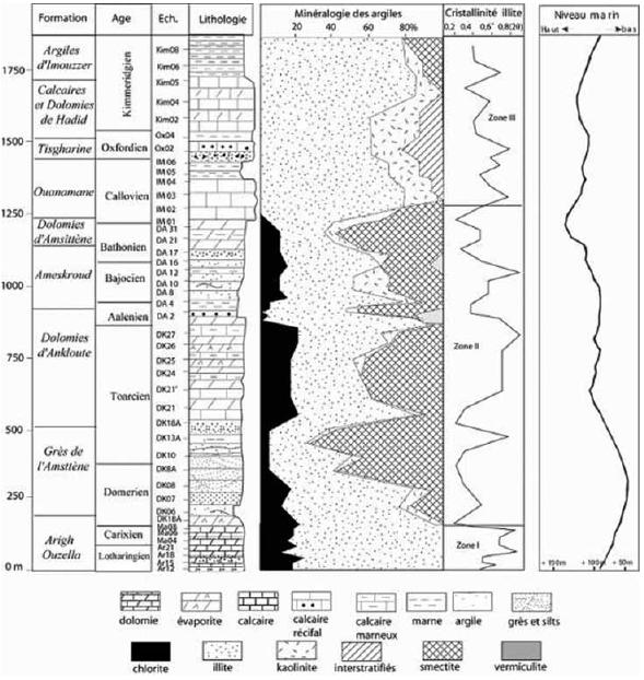 Zone minéralogique III (Callovien-Kimméridgien): elle comprend les formations dOuanamane, de Tildi, dIggui El Behar et dImouzzer; la fraction argileuse associée aux faciès de cette zone se caractérise par la disparition simultanée de la smectite et de la chlorite et par le développement de lillite (jusquà 85% de la fraction argileuse de certains niveaux). Les interstratifiés irréguliers du type illite-smectite et chlorite-smectite se développent également dans la première moitié de cette zone; ils représentent en moyenne 15 % de la fraction argileuse; vers la partie supérieure, la smectite commence à se développer aux dépens des interstratifiés irréguliers; la kaolinite, dont la teneur peut atteindre 30 %, est présente dans toute la zone, avec une légère baisse de la teneur vers le sommet.
