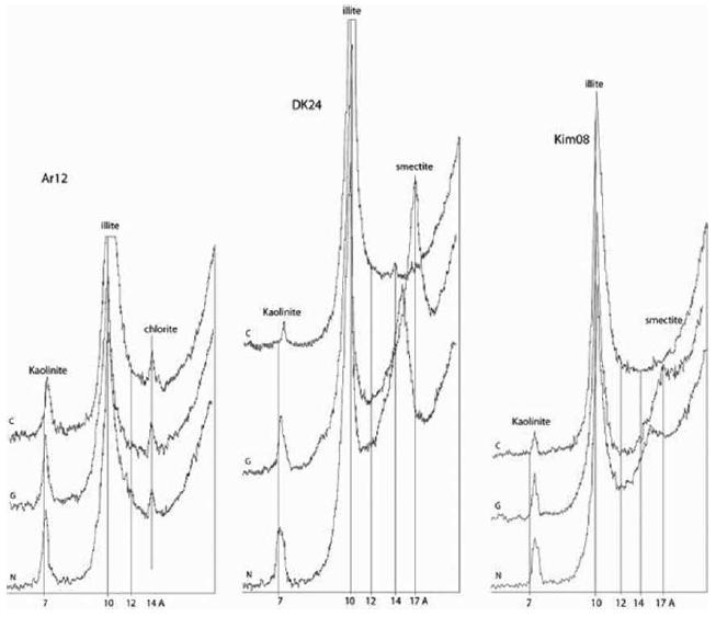 Fig. 4 Diffractogrammes types des différentes zones minéralogiques (N: naturel, G:glycolé, C: chauffé, Ar12:zone minéralogique I, DK24:zone minéralogique II, Kim08:zone minéralogique III).