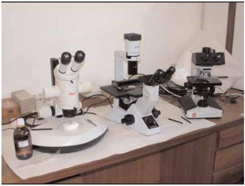 Fig. 2 – Combinação de material óptico para estudos de microscopia electrónica de varrimento. Da esquerda para a direita, lupa binocular, microscópio óptico invertido e microscópio óptico normal.