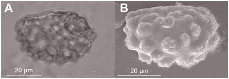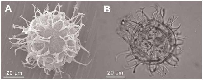 – Cleistosphaeridium placacanthumin OM (A) and SEM (B).
