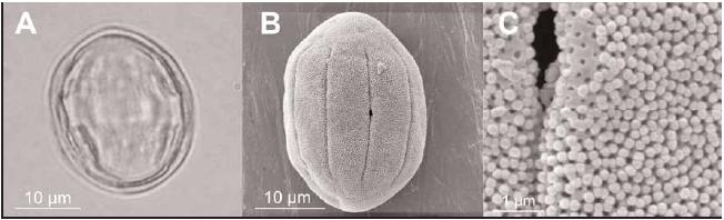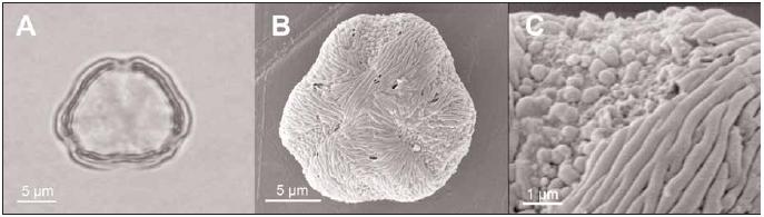 Fig. 4 – Lythrumsp.em MO (A) e MEV (B e C-detalhe da ornamentação da exina).