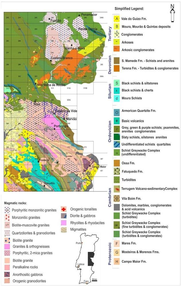 The study area encompasses both the Central Iberian Zone (CIZ) and the Ossa-Morena Zone (OMZ) of the Variscan Orogen (Figure 1). The CIZ includes, from North to South, the Cambrian Schist-Greywacke Complex, intruded by granitic plutons at Idanha-a-Nova, Penamacor, Castelo Branco, Nisa and Portalegre, the Paleogene Beira Baixa Arkoses and related Mio-Pliocene sandstone and conglomerate formations and the Ordovician Quartzite ridges of Salvador – Penha Garcia – Monfortinho, Vila Velha de Ródão and Portalegre. The OMZ includes the Série Negra Formation in the Tomar-Cordoba Shear Zone and Ordovician peralkaline rocks and Cambrian meta-sedimentary rocks locally intruded by granitic plutons (Fronteira and Ervedal).