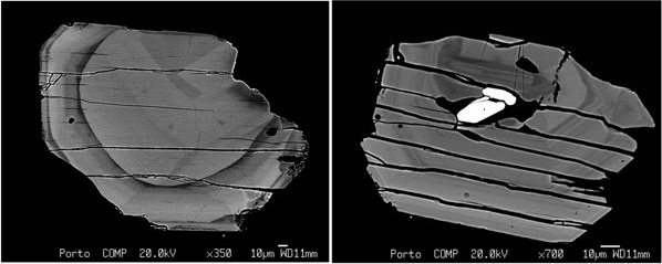 – Grãos de xenótimo em imagens de electrões retro-difundidos (inclusão branca na imagem da direita é monazite).