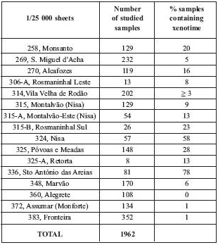 The identification of xenotime was the result of the study of 1962 pan samples (Table 1), collected in Central Eastern Portugal, within the framework of a reconnaissance survey targeted at the identification of rare earth mineral-bearing horizons, during 1995-2007 (INVERNO et al., 2007).