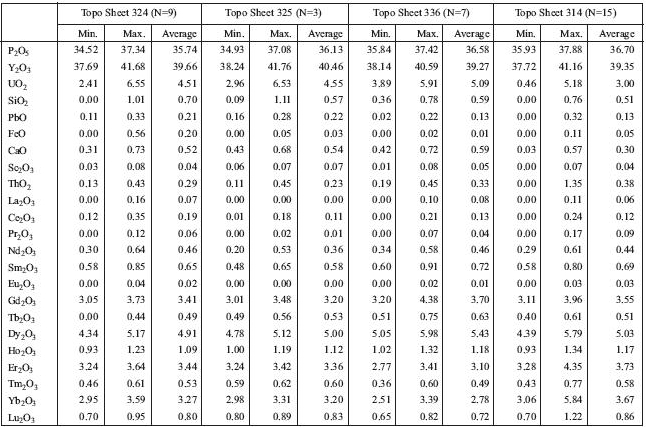 EPMA analyses of detrital xenotime grains from four different topographic sheets (Table 2) reveal relatively minor variations in chemical composition between the different sheets, though there is some variation within each sheet. The main substitutions of Y in xenotime are, in decreasing order, Dy, U, Gd, Er, Yb and Ho.