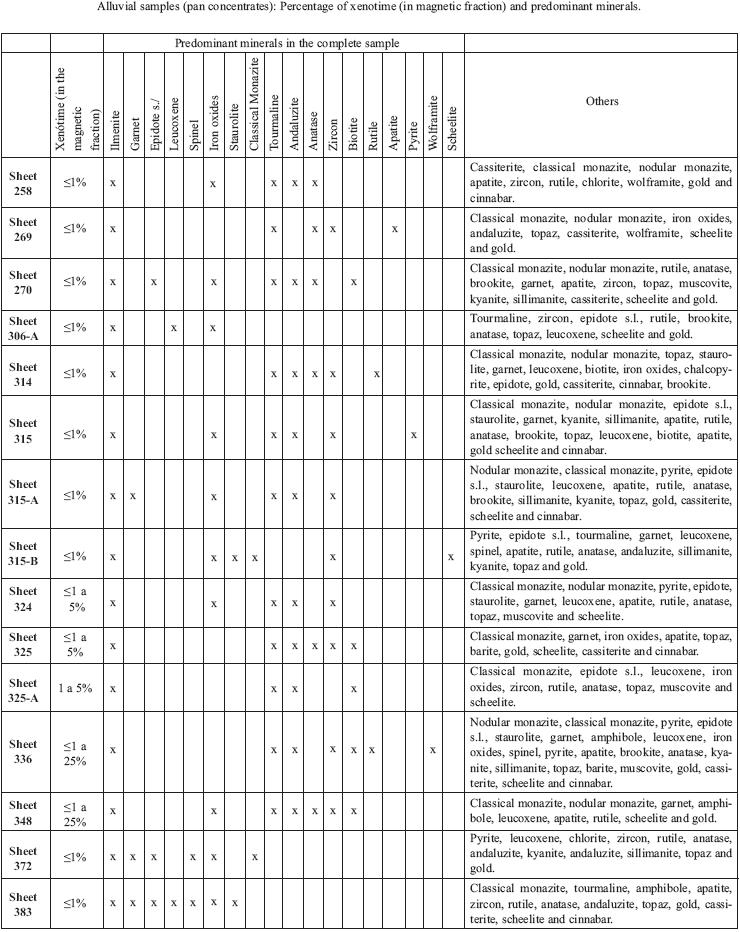 Amostras aluvionares (concentrados à bateia): Percentagem de xenótimo (na fracção magnética) e minerais predominantes