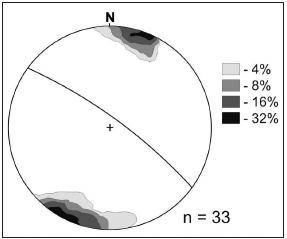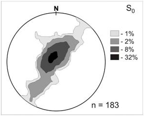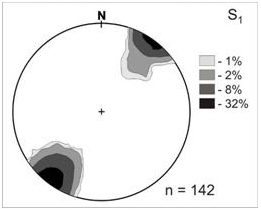 – Stereographic projection of S1 cleavage poles (contoured equal area lower hemisphere), from Peso da Régua Sector (main frequency around N74ºW, 83ºS).