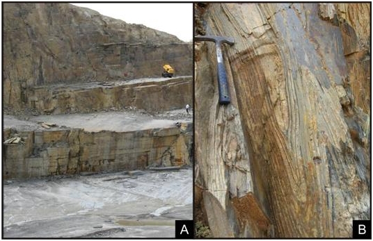 Fig. 11 – Estilo de dobramentos D1 no sector de Vila Nova de Foz Côa. (A) Zona de charneira muito ampla do sinclinal de 1.ª ordem do Poio; (B) Dobramentos de 2.ª ordem muito apertados associados ao anticlinal de Vale Moinhos.