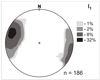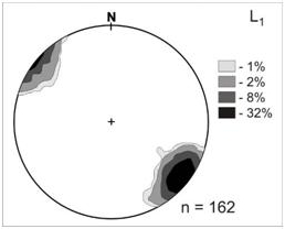 – Stereographic projection of L1 intersection lineation (contoured equal area lower hemisphere), from Vila Nova de Foz Côa Sector (main frequency around 9º, S52ºE).