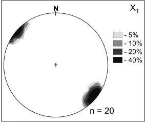 – Stereographic projection of X1 stretching lineation (contoured equal area lower hemisphere), from Vila Nova de Foz Côa Sector (main frequency around 5º, S51ºE).