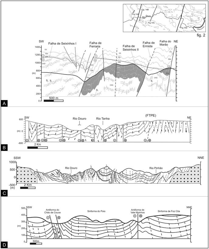 – Geological cross-sections in Marão – Vila Nova de Foz Côa axis: A – Seixinhos sector – Serra do Marão (Coke, 2000); B – Peso da Régua sector; Alijó sector (Sousa et al., 1987); D – Vila Nova de Foz Côa sector (Búrcio, 2004).