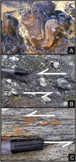 Fig. 2 – Estruturas associadas à deformação D1 Varisca nos sectores setentrionais do Autóctone da Zona Centro-Ibérica desenvolvidas em quartzitos ordovícicos. (A) Dobras mesoscópicas com clivagem de plano axial na região de Torre de Moncorvo; (B) Componente de cisalhamento esquerdo marcada pela distorção de clastos de quartzo em metaconglomerados; (C) Componente de cisalhamento esquerdo marcada por fábricas do tipo C-S.