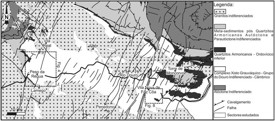 Os trabalhos agora realizados mostram que esta alternância de extensas zonas pouco deformadas intercaladas com estreitos corredores de deformação mais intensa é passível de ser seguida, em toda a região setentrional do Autóctone da Zona Centro-Ibérica, desde o Sector de Vila Nova de Foz Côa até à Serra do Marão. A continuidade lateral de toda a estrutura é apenas afectada pelos rejeitos esquerdos associados às falhas tardi-variscas (e.g., Falha da Vilariça e Penacova-Régua-Verin), posteriormente reactivadas durante o ciclo Alpino, de orientação geral NNE-SSW, bem marcada no Sector de Peso da Régua (Fig. 5), onde as faixas deformadas são claramente rejeitadas pelas estruturas anteriormente referidas (Fig. 3).