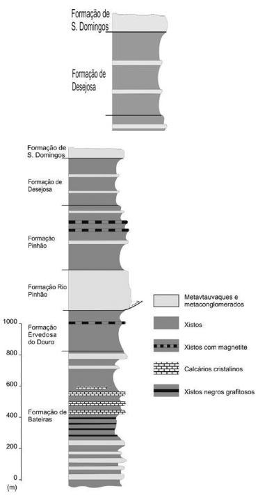 A sequência do Grupo do Douro (onde se inserem as áreas estudadas) foi estabelecida por Sousa (1982), que distinguiu seis formações (da base para o topo): Bateiras, Ervedosa, Rio Pinhão, Pinhão, Desejosa e S. Domingos. Trabalhos posteriores (Silva & Ribeiro, 1985; Silva et al., 1995) mostraram que algumas destas formações estariam duplicadas tectonicamente devido ao carreamento gravítico sin-sedimentar da S.ª do Viso. A identificação deste acidente sin-sedimentar ocorrido durante a sedimentação da Formação da Desejosa (Silva & Ribeiro, 1985; Coke et al., 2000b), permitiu explicar a semelhança de fácies entre a Formação da Ervedosa e a Formação do Pinhão e entre a Formação Bateiras e a Formação de Rio Pinhão, pelo que actualmente se considera a existência de apenas quatro formações: Bateiras, Ervedosa, Desejosa e S. Domingos (Fig. 4).
