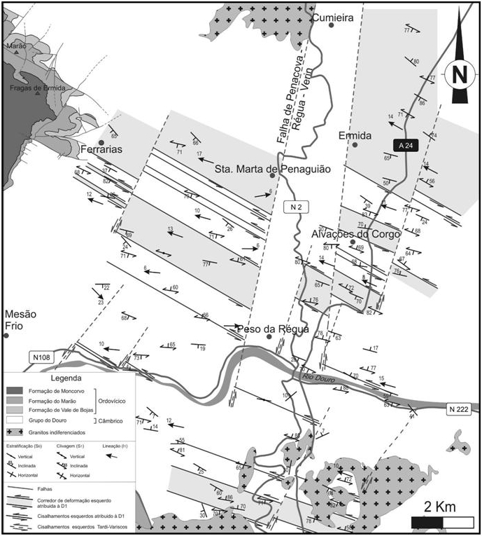Apesar da existência de uma grande homogeneidade na geometria das estruturas Variscas neste sector, esta homogeneidade não é real quando se tem em conta a sua distribuição espacial. Com efeito, em faixas, de dimensão variável (métrica a decamétrica em geral, mas atingindo por vezes uma largura quilométrica), o dobramento amplo dá lugar a dobras apertadas também com uma direcção geral WNW-ESE, onde a estratificação se apresenta muito verticalizada. Embora nestes sectores mais deformados os critérios cinemáticos não sejam muito claros devido à homogeneidade das formações do Grupo do Douro, é provável que eles correspondam às zonas de cisalhamento esquerda D1 que têm sido identificadas a nível regional (Ribeiro et al., 1990; Dias & Ribeiro, 1995), tanto mais que no sector de Ferrarias as faixas mais deformadas se encontram na continuidade de um dos principais corredores de cisalhamento esquerdos identificados na Serra do Marão (Fig. 5; Coke, 2000, Dias et al., 2006).