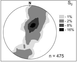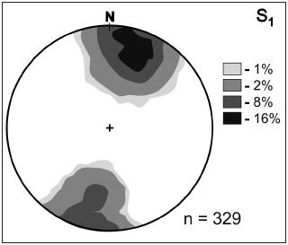 No que se refere à clivagem (S1), no sector em causa esta apresenta uma atitude média de N74ºW, 83ºS, compatível com a ligeira vergência para NNE das estruturas (Fig. 7). No entanto, como seria espectável, existe uma ligeira variabilidade, principalmente no que se refere à inclinação desta estrutura planar, a qual pode ser explicada, tanto pela tendência para que a clivagem se desenvolva em leque, como por oscilações normais em torno de uma posição subvertical; a possibilidade da dispersão ser causada pela influência de deformações posteriores não é de prever, tendo em consideração o fraco desenvolvimento que estas apresentam na região estudada.