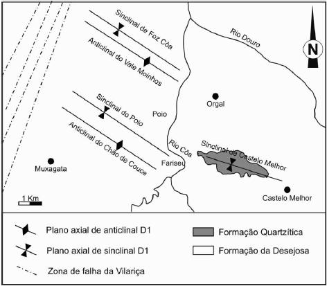 Esta geometria tinha sido já referenciada por Sousa (1982), para a estrutura geral do Grupo do Douro, caracterizada por sinformas amplos separados por antiformas estreitos.