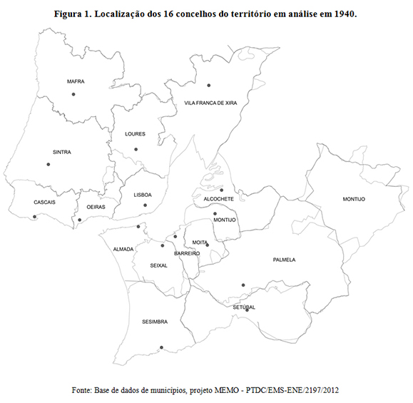 O território em análise cobre uma área total de 2935 hectares que abrange atualmente dezoito municípios. Em 1940, este mesmo território era constituído por apenas dezasseis municípios. Descriminam-se em seguida os municípios da AML em 1940, ordenados geograficamente de Norte a Sul: Vila Franca de Xira, Mafra, Loures, Sintra, Cascais, Oeiras, Lisboa, Alcochete, Montijo, Almada, Barreiro, Moita, Seixal, Palmela, Setúbal e Sesimbra.