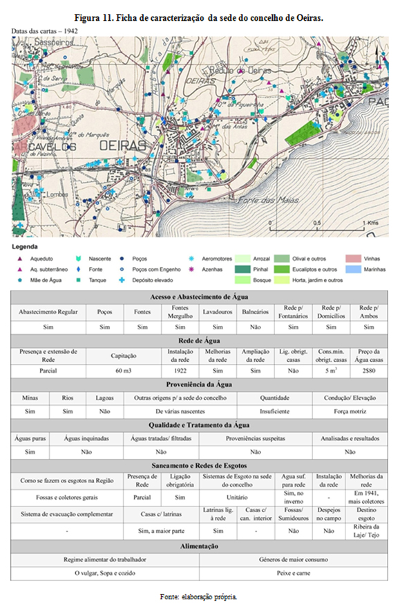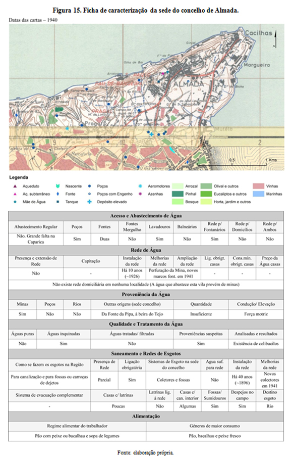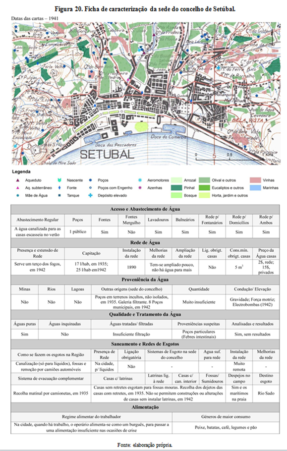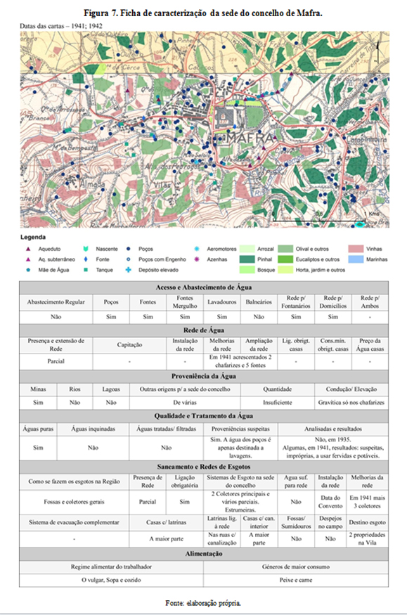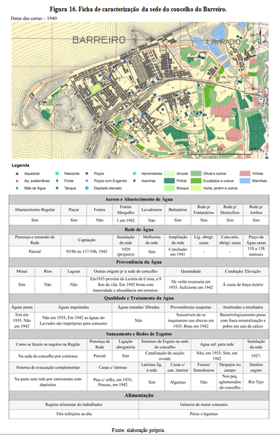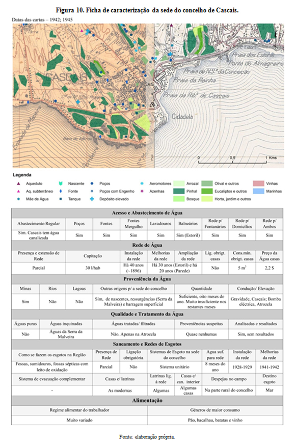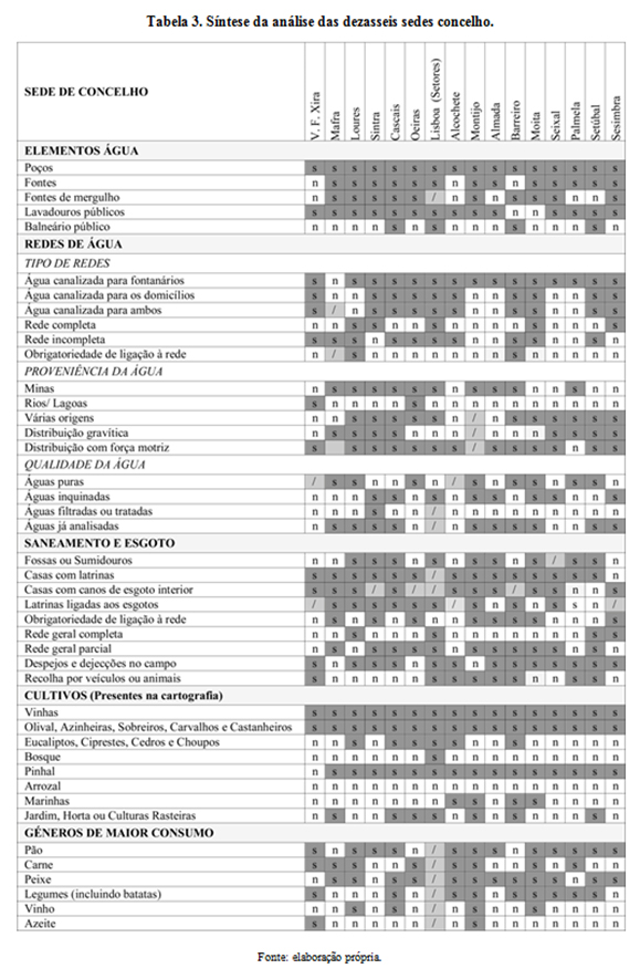 Todos estes indicadores constituem as entradas de informação incluídas nas fichas de caracterização para cada uma das sedes de concelho em análise, exceto Lisboa. A tabela síntese relativa à cidade de Lisboa apresenta uma variação nos indicadores, resultado da informação apenas ter sido contemplada na Segunda Notícia (MIDGSP, 1942) e desta não ter sido fornecida pelos seis delegados de saúde do Ministério do Interior sob a forma de respostas a cada uma das questões colocadas.