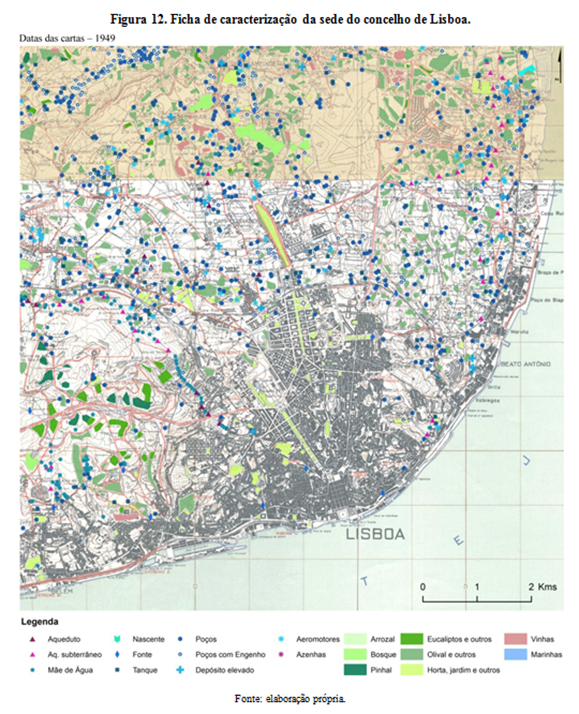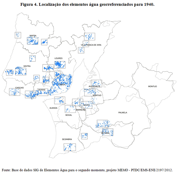 A Carta Militar de Portugal permite identificar para o território em análise todos os elementos de apoio à utilização da água, construídos pelo Homem, e que foram alvo de um levantamento, constituindo-se assim uma Base de dados SIG de Elementos Água da AML cerca de 1940 que pode ser comparada com a Base de dados SIG de Elementos Água da AML cerca de 1900, criada a partir da Carta dos Arredores de Lisboa, do Corpo do Estado Maior. Na base de dados de elementos de apoio à utilização da água, para 1940 foram identificados onze elementos construídos pelo Homem. Designadamente: aeromotores; aquedutos (incluindo elevados e subterrâneos); azenha; depósito de água; fonte; mãe de água; nascente; poço; poço com engenho; e tanque.