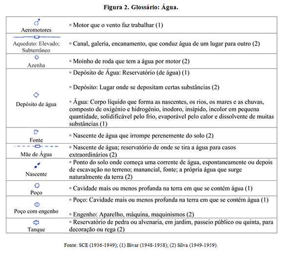 A seleção dos termos contemplados neste Glossário provém da análise efetuada às legendas da Carta Militar de Portugal (SCE, 1936-1949), de onde foram extraídos dezanove símbolos relativos aos temas Água e Cultivos (ver figuras 2 e 3). Para os 29 termos considerados foram selecionadas as definições que apresentavam maior concordância entre autores e que melhor respondiam aos objetivos do projeto MEMO.