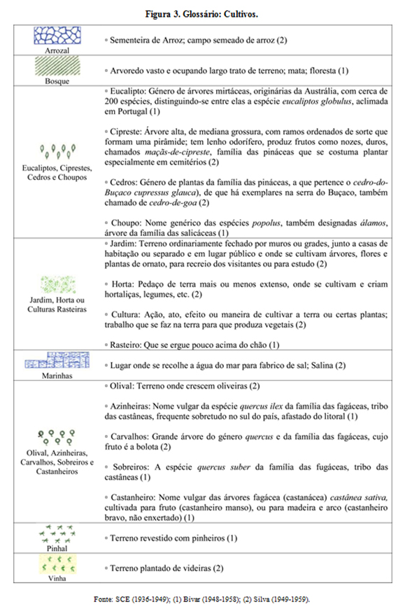 Para a elaboração do Glossário que de seguida se apresenta, recorreu-se a duas fontes bibliográficas: a) Dicionário Geral e Analógico da Língua Portuguesa (Bivar, 1948-1958); e b) Grande Dicionário da Língua Portuguesa (Silva, 1949-1959). A seleção destas obras teve em consideração a sua relevância na história da lexicografia portuguesa (Verdelho, 2002; Verdelho, 2003), bem como a edição mais próxima da cartografia utilizada (c. 1940).