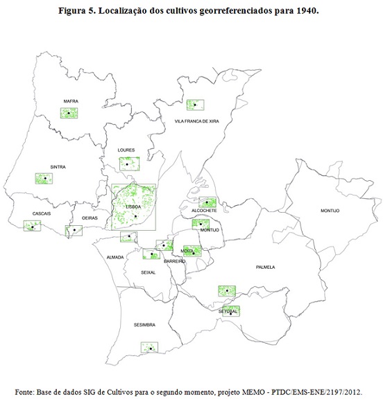Relativamente aos cultivos, para o período em análise, destaca-se a presença da vinha bem como olivais, azinheiras, carvalhos, sobreiros e castanheiros. Também o pinhal se encontra presente em praticamente todas as sedes de concelho com exceção de Vila Franca de Xira. As categorias eucaliptos, ciprestes, cedros e choupos surgem menos representativas nos extratos da cartografia analisados, surgindo apenas em torno de seis sedes de concelho (Alcochete, Barreiro, Cascais, Lisboa, Loures, Oeiras). O arrozal não estava presente nas sedes de concelho embora existisse na região de Vila Franca de Xira, Alcochete e Sesimbra. As marinhas, onde se produzia sal, localizavam-se em quatro sedes de concelho da margem sul do Tejo (Alcochete, Barreiro, Moita e Montijo). No que concerne a jardins, hortas ou culturas rasteiras, esta categoria surge em sete sedes de concelho de carácter mais urbano (Barreiro, Cascais, Lisboa, Montijo, Oeiras e Setúbal) ou onde existiam propriedades reais (Mafra).