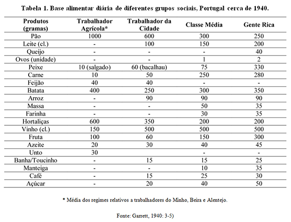 Servindo-se de animais para o transporte e do caminho-de-ferro ou do barco quando se tratavam de concelhos localizados na margem sul do Tejo, à capital chegavam diariamente uma diversidade de produtos com vista a satisfazer as necessidades alimentares dos seus 694.389 habitantes (INE, 1945). Como trabalhadores citadinos que eram na sua maioria, usufruíam de um acesso facilitado a esta diversidade de produtos alimentares, pois encontravam-se à venda não só em numerosos mercados mas também em mercearias locais. Mas se, para o médico António de Almeida Garrett (1884-1961), o Português é gente que umas vezes come e bebe à farta, e outras vezes (e são as mais) passa com privação do mínimo indispensável (Garrett, 1957), a verdade é que, por esta altura, vulgariza-se o consumo de pão de trigo, chegando mesmo a ser considerada a base da alimentação do povo português, sendo 384 gramas o valor calculado para o consumo diário de um indivíduo (Faria, 1950). Almeida Garrett identificou para quatro grupos sociais trabalhador agrícola, trabalhador da cidade, classe média e gente rica os alimentos que constituem a base da alimentação diária, conforme indicado na tabela 1.