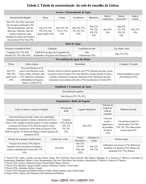 Destas duas notícias, que visavam reconstruir a imagem do estado sanitário de Portugal, foram analisados os inquéritos correspondentes às sedes dos dezasseis concelhos que formam a atual Área Metropolitana de Lisboa. Partiu-se da análise da Segunda Notícia (MIDGSP, 1942) e sempre que nesta publicação houvesse indicação da inexistência de alterações face à (primeira) Notícia (MIDGS, 1935), a informação que prevaleceu foi a mais recuada, ou seja, a proveniente da Notícia dos Inquéritos de Higiene Rural e sobre Águas e Esgotos (MIDGS, 1935). Relativamente à cidade de Lisboa, uma vez que esta não foi contemplada na Segunda Notícia (MIDGSP, 1942), a apresentação do estado das Águas e Esgotos foi transformada em relatórios (entregues em 1936) por cada um dos seis delegados de saúde do Ministério do Interior e contemplados na publicação de 1942. O panorama sanitário da cidade de Lisboa foi deste modo subdividido em seis sectores, cada um deles abrangendo determinados bairros e/ou zonas da capital (ver Tabela 2).