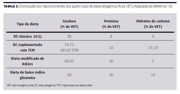 A DC por si só exige uma alteração drástica da alimentação e, normalmente, pode não ser muito bem tolerada no início. Por outro lado, é um regime alimentar muito exigente, uma vez que é necessária a quantificação dos vários alimentos com vista a controlar as crises epilépticas. Ao longo do tempo têm surgido outras alternativas à DC tradicional, com vista a aumentar a qualidade de vida do doente e da família. Estas são mais liberais, mas com efeito semelhante no controlo das crises. Uma das primeiras alternativas à DC tradicional foi a DC suplementada com triglicerídeos de cadeia média, que têm um efeito mais cetogénico que os de cadeia longa, presentes na DC clássica (1, 41). A dieta modificada de Atkins foi criada com o intuito de ser menos restritiva e aumentar a palatibilidade, especialmente para crianças com problemas comportamentais e adolescentes em que os pais e neurologistas estão relutantes em iniciar a DC (42). Esta pode ser iniciada em casa sem jejum, nem restrição calórica e hídrica (11). Neste caso, os hidratos de carbono são restritos a 10g/dia em crianças e 20g/dia em adultos, sendo que o consumo de gordura é encorajado, de forma a manter o estado de cetose (11). Por último, a dieta de baixo índice glicémico é outra alternativa apresentada, que permite uma maior liberalização da quantidade total de hidratos de carbono, mas restrita a alimentos com baixo índice glicémico (inferior a 50), de forma a manter níveis glicémicos estáveis (11, 43). Esta alternativa também poderá ser iniciada em casa, sem o jejum inicial (11). Na Tabela 2 encontra-se a distribuição