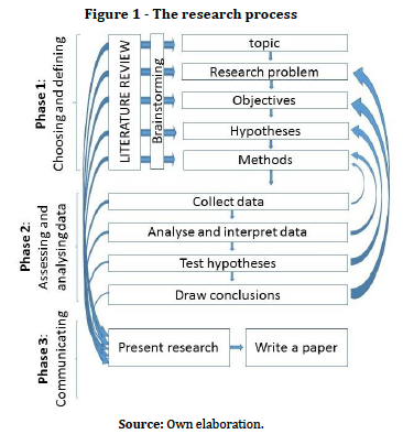 The research process is, in most cases, the implementation of a previously designed research plan. As shown in Figure 1, the research process is divided into three phases, each one comprising several steps. Phase one, choosing and defining, is theoretical or conceptual and based on a literature review. In this phase, you choose and define the fundamentals of your research: topic, research problem, objectives, hypotheses and methods. Much search, brainstorming and adaptation may be necessary during this phase. Regardless, you should not go on to the next phase – for instance, collecting data – before making the right decisions regarding research problem, objectives, hypotheses and methods.