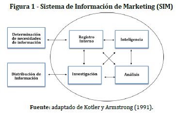 El SIM está basado en un proceso sistemático de información con alto valor estratégico, abarcando redes sociales de clientes, profesionales y otros agentes (Morales & Hernández, 2011). Como López-Bonilla y López-Bonilla (2012; 2014) indican, Phillip Kotler y sus colaboradores han refinado y divulgado el concepto del SIM, definiéndolo como una estructura estable de interacción, integrada por un conjunto de personas, instrumentos y procedimientos dedicados a la recogida, clasificación, análisis, valoración y distribución de la información para el uso de los responsables de marketing (Kotler & Armstrong, 1991). Dicho autor y sus colaboradores han propuesto un modelo estructural del SIM ampliamente conocido, basado en cuatro componentes o subsistemas, que se detallan seguidamente (ver figura 1).