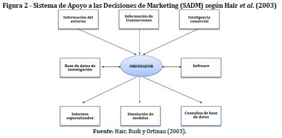 Little (1979) describe el SADM como la colección coordinada de datos, sistemas, herramientas y técnicas, con programas y ordenadores de apoyo, que permite a una organización obtener e interpretar la información relevante sobre su actividad y su entorno y hacer de ella la base de sus actividades de marketing. Dillon, Madden y Firtle (1994) establecen una clara diferencia a través de la orientación humanística que posee el SADM, considerando que la solución de los problemas comerciales se halla en la propia dirección de la organización y no tanto en la tecnología utilizada. En un mismo sentido, Trespalacios, Vázques y Bello (2005) sostienen que el SADM asume los cambios sustanciales producidos por las nuevas tecnologías de la información que hacen posible una ayuda mucho más directa y adaptada al decisor.