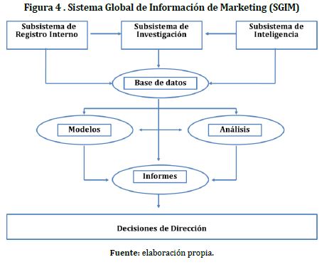 Como se ha podido apreciar, las estructuras del SIM y del SADM son diferentes. El SIM aparenta una mayor inclinación hacia la determinación y búsqueda de las fuentes de información apropiadas, mientras que el SADM hace un mayor énfasis hacia el tratamiento y gestión de esas fuentes de forma eficiente, aprovechando los recursos tecnológicos, y de forma eficaz, facilitando su conexión con el usuario. Pero estos sistemas son más complementarios que excluyentes. Es decir, hay que entenderlos en una relación de continuidad más que de solapamiento. Por ello, es posible establecer una configuración híbrida entre ambos. Algunos autores ya lo habían propuesto, pero se han limitado a sustituir el subsistema de análisis del SIM por el Sistema de Apoyo a las Decisiones de Marketing. Creemos conveniente representar una estructura nueva a partir de los dos sistemas evitando un exceso de simplificación. En la figura 4 se representa esta estructura, a la que hemos asignado el término de Sistema Global de Información de Marketing (abreviadamente, SGIM).