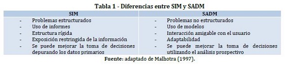 Luque (1997) señala que ambos sistemas de información proporcionan apoyo a las decisiones, pero el SADM es un sistema que dispone de una modelización más desarrollada que el SIM. En este sentido, como apunta Malhotra (1997), el SADM se ha desarrollado para superar las limitaciones del SIM. Este autor indica que ambos sistemas combinan el uso de modelos o técnicas analíticas con las funciones de acceso y recuperación tradicionales del SIM; ambos son fáciles de usar de modo interactivo y pueden adaptarse tanto a los cambios del entorno como al enfoque de toma de decisiones que siga el usuario. Pero, siguiendo a Gupta y Kohli (1990), se puede subrayar una serie de diferencias entre ellos, que incluimos en la tabla 1.