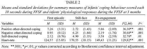 In a 3-months healthy prematurely born sample, Fuertes, Lopes dos Santos, Beeghly and Tronick (2006, 2009) found different types of infant coping behaviour during Tronick’s Face to Face Still-Face Paradigm (FFSF; Tronick, Als, Adamson, Wise, & Brazelton, 1978): a Positive Other-Directed Coping that reflects the infants’ tendency to elicit social interaction and exhibit positive affect during the FFSF; a Negative Other-Directed Coping that reflects the infants’ tendency to exhibit negative affect and distancing behaviour during the FFSF; and a Self-Directed Coping that reflects the infant’s tendency to engage in self-directed coping behaviours during the FFSF. Further studies with full term babies found the same three types of coping behaviour.