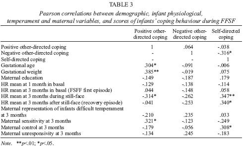 Three sets of statistical analyses were carried out to address the goals of this study. First, using bivariate analyses differences in Infants’ Coping Behaviour and HR (Heart Rate) were evaluated among the three Face to Face Still Face episodes. Second, the correlation association between Infants’ Coping Behaviour (Positive Other-Directed Coping, Negative Other-Directed, Self-Directed Coping) and each potential predictor variable was evaluated. The potential predictor variables included birthweight, gestational age, infant gender, maternal age, maternal education, SES, maternal representations of the infants’ difficult temperament, HR mean in basal (at 1 and 3 months), HR mean during FSFF episodes, and the three rated dimensions of mothers’ interactive behaviour observed during play at the 3-month visit. Alpha was set at .05. Third, the independent contributions of infant, maternal, and demographic variables to infant regulatory behaviour during FSFF were evaluated using multiple regression analyses. Only variables identified as being significantly associated with Infant Coping Behaviour in the correlational analyses were evaluated as potential predictors in these regressions.