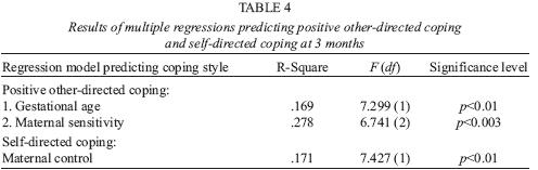 Since priori studies performed with prematurely born infant found that types of coping behaviour predict attachment status (Braungart-Rieker, Garwood, Powers, & Wang, 2001; Fuertes et al., 2006, 2009), we investigate the predictive impact of a set of infant, maternal and demographic factors on Positive Other-Directed, Negative Other-Directed and Self-Directed Coping behaviour.
