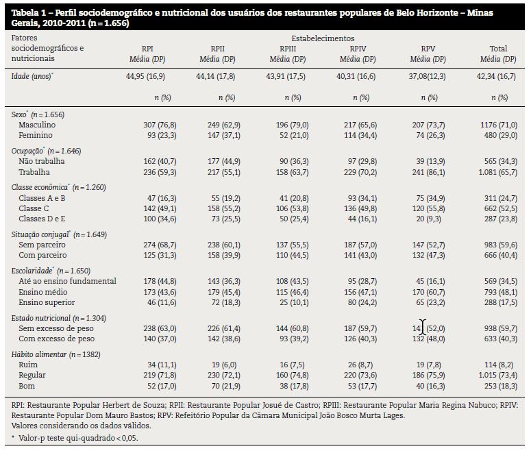 A amostra apurada de adultos usuários dos restaurantes populares de Belo Horizonte nos estabelecimentos RPI, RPII, RPIII, RPIV e RPV foi de 372, 370, 260, 331 e 280, respectivamente, perfazendo uma amostra total de 1.613 usuários por dia.