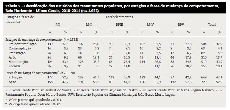 Porém, ao comparar as referidas fases dos usuários, por estabelecimento, verificou‐se que houve diferença estatisticamente significativa (p = 0,001). Nos restaurantes RPI e RPIII houve maior prevalência de usuários classificados na fase de pré‐ação. Já nos restaurantes RPII, RPIV e refeitório RPV houve maior prevalência de usuários classificados na fase de ação.