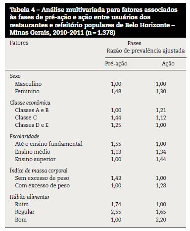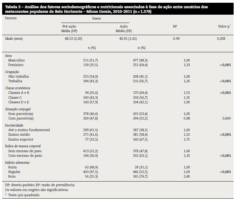 Na análise univariada, buscando os fatores sociodemográficos e nutricionais associados às fases de mudança de comportamento do modelo transteórico, observou‐se associação significativa (p < 0,05) e maior prevalência da fase de ação para os entrevistados do sexo feminino, que trabalham, das classes sociais A e B, com escolaridade superior, com excesso de peso e hábito alimentar bom (tabela 3).